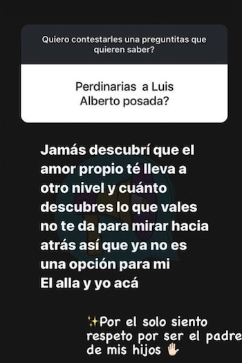 Una de estas fue: ¿perdonarías a Luis Alberto Posada? Catalina respondió en dos mensajes. El primero de estos hablaba sobre el amor propio y donde dio a entender que no regresaría con Posada: “Jamás, descubrí que el amor propio te lleva a otro nivel y cuando descubres lo que vales no te da para mirar hacia atrás… Así que ya no es una opción para mí. Él allá y yo acá”.