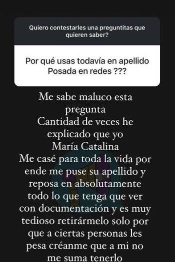 “Me sabe maluco esta pregunta”, inició, “Cantidad de veces he explicado que yo, María Catalina, me casé para toda la vida, por ende, me puse su apellido y reposa en absolutamente todo lo que tenga que ver con documentación…” afirmó.