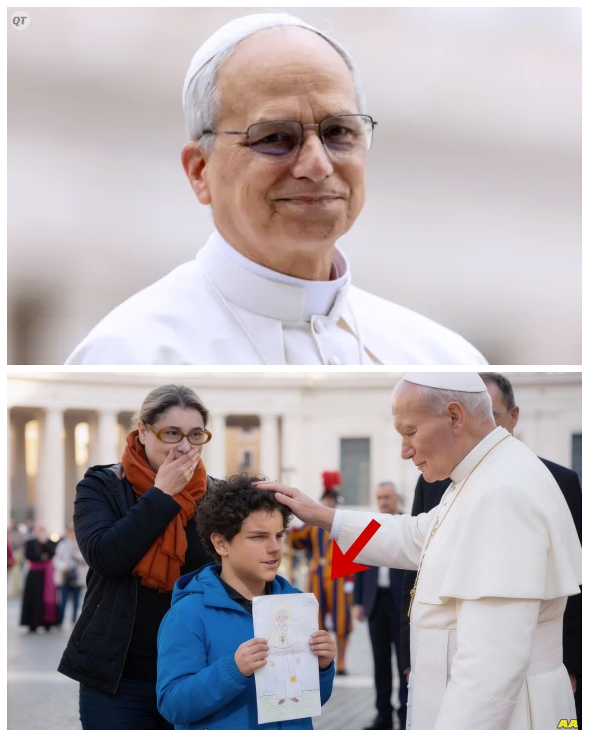 Él se acercó confiadamente a Papa con seguridad natural, que sugería familiaridad, reconocimiento, en lugar de primer encuentro intimidante, manteniendo contacto visual directo y con postura extraordinaria, notable para niño de 8 años, conociendo personalmente figura de autoridad católica máxima mundial.