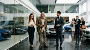 Una mañana, un anciano vestido con ropa gastada entró en un concesionario de autos de lujo. Su voz temblaba un poco, pero su mirada era firme. Señalando a la joven que lo acompañaba, dijo: