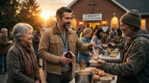 Una noche, mientras ayudaba a repartir comida, vio a una mujer mayor acercarse.
