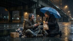 Daniel estaba sentado bajo un puente, intentando protegerse del aguacero que caía sobre la ciudad. Su ropa estaba empapada y el frío le atravesaba los huesos.