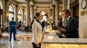 Alejandro asintió despacio y volvió a agarrar la fregona. La mañana avanzó como avanzan las mañanas en los hoteles de cinco estrellas, [música] con la calma de quien parece que no pasa nada y el caos de quien sabe que siempre pasa algo.